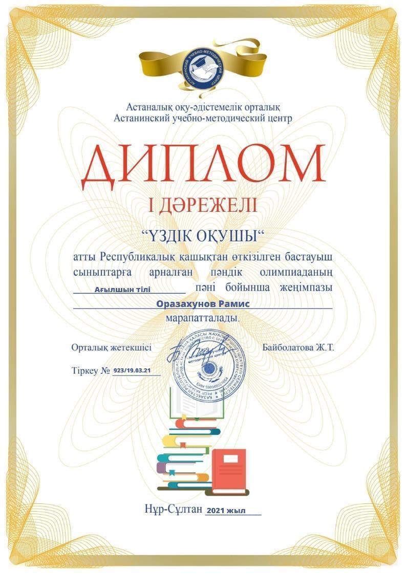 Астаналық оқу-әдістемелік орталығы ұйымдастырған "ҮЗДІК ОҚУШЫ" атты Республикалық пәндік олимпиадаға орыс тілі пәнінен 4 "Ә" сынып оқушылары Қидарбек Іңкәр, Оразахунов Рамис, Мақсұт Ерзада, Берік Әліби, Ахмет Алиялар қатысып, ж