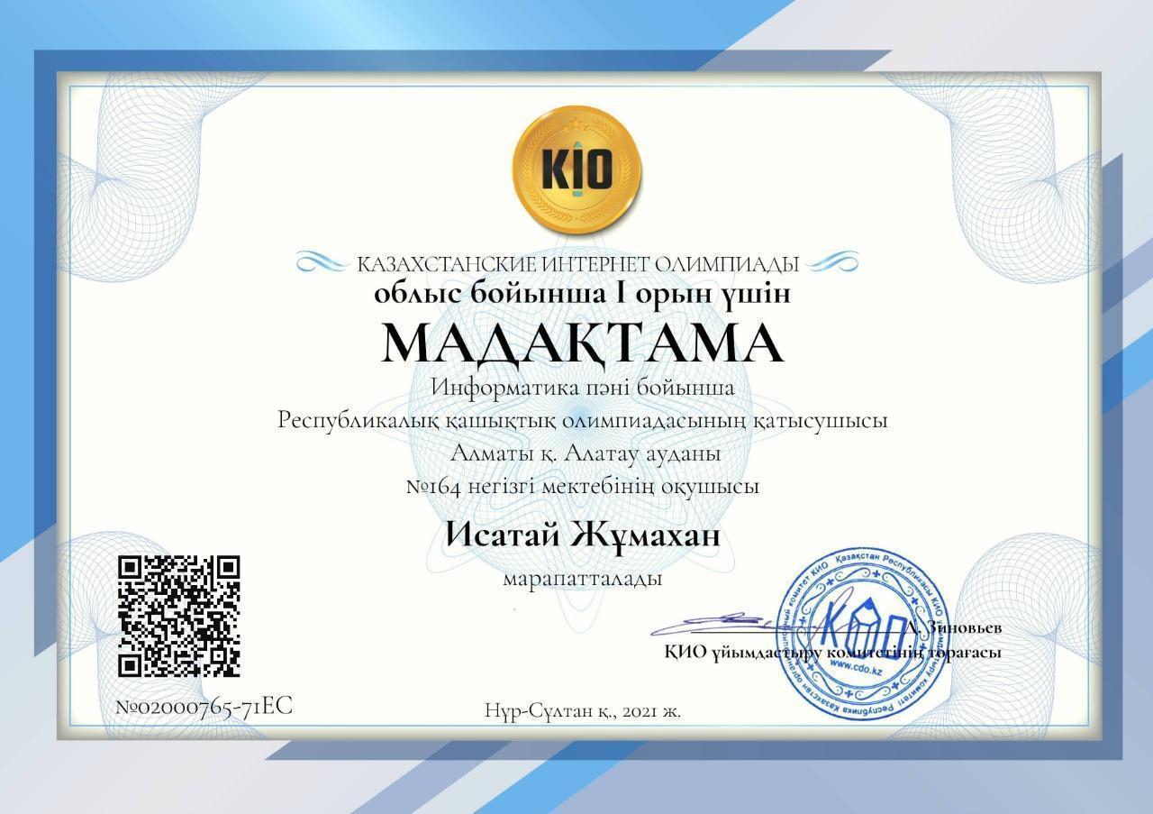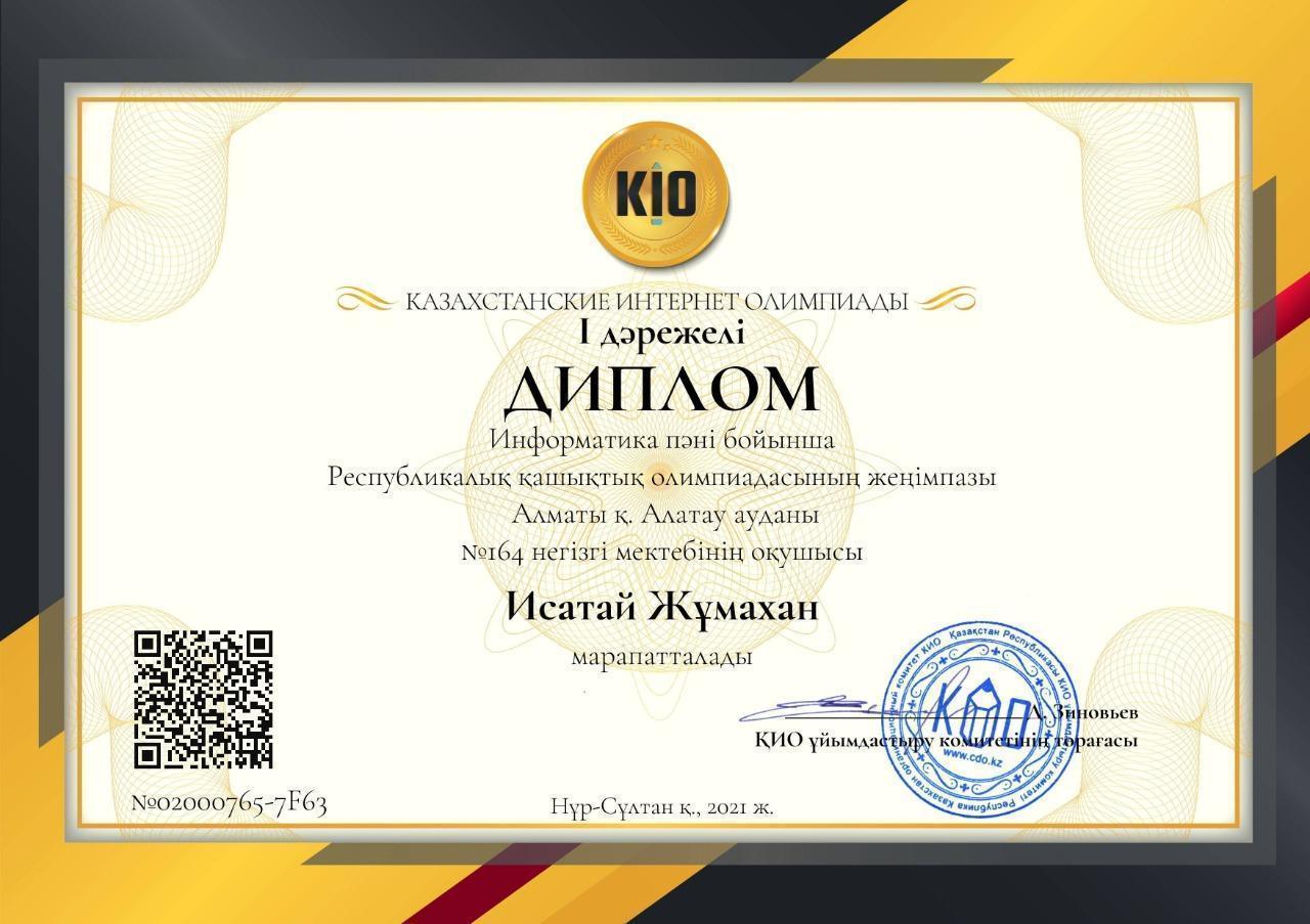 №164 Жалпы білім беретін мектеп » Біз туралы » Жетістіктеріміз » Республикалық KIO қашықтық олимпиадасына информатикадан қатысып, І орынға ие болған 6 "А" сынып оқушысы Үсербай Ерасыл мен 9 "А" сынып оқушысы Жұмахан Исатай, ІІ орын иегері 11А сынып оқушысы Еренші Ердаулет, 6А сынып оқушысы Дауренбек Дос