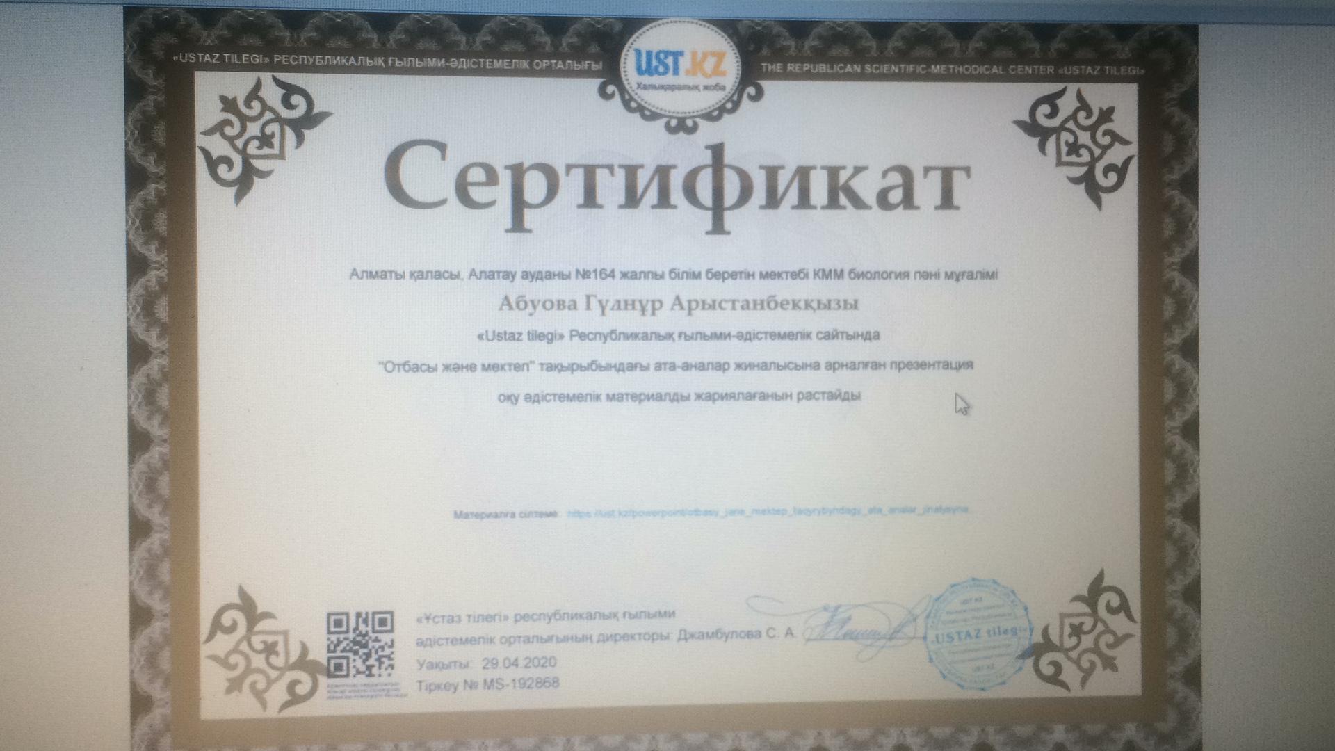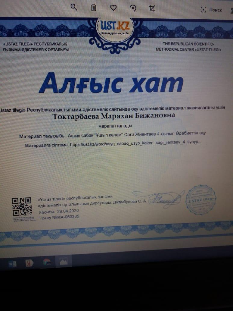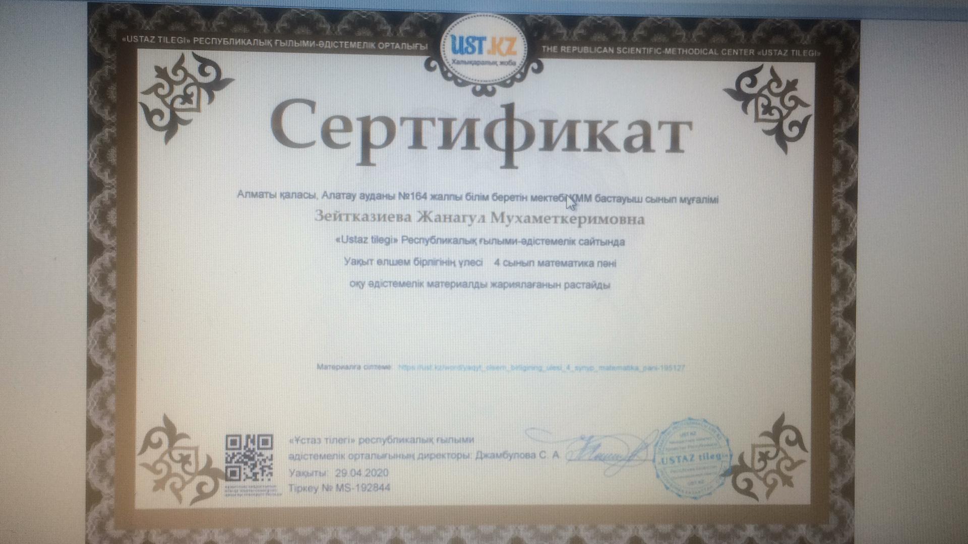 Бастауыш сынып мұғалімдері Әбенова Б.Ә, ТоқтарбаеваМ.Б, Зейтказиева М.Ж, Абуова Г.А "Ustaz tiegi" Республикалық ғылыми-әдістемелік сайтына материал жариялап, Сертификат, Алғыс хат, Құрмет грамоталарына ие болды.