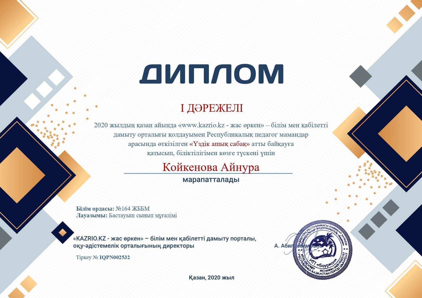 №164 Жалпы білім беретін мектеп » Біз туралы » Жетістіктеріміз » Мектебіміздің бастауыш сынып мұғалімі Койкенова Айнур "Жас өркен" -білім мен қабілетті дамыту орталығы қолдауымен Республикалық педагог мамандар арасында өткізілген "Үздік ашық сабақ"атты байқауға қатысып І дәрежелі дипломмен марапатталды