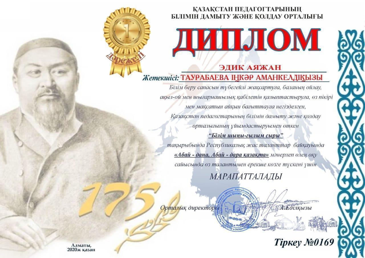 "Білім шыңы- ғылым сыры" тақырыбындағы Республикалық жас таланттар байқауында "Абай-дана, Абай-дара қазақта" атты мәнерлеп оқу сайысына қатысып оқушыларымыз жүлделі орындарға ие болды.