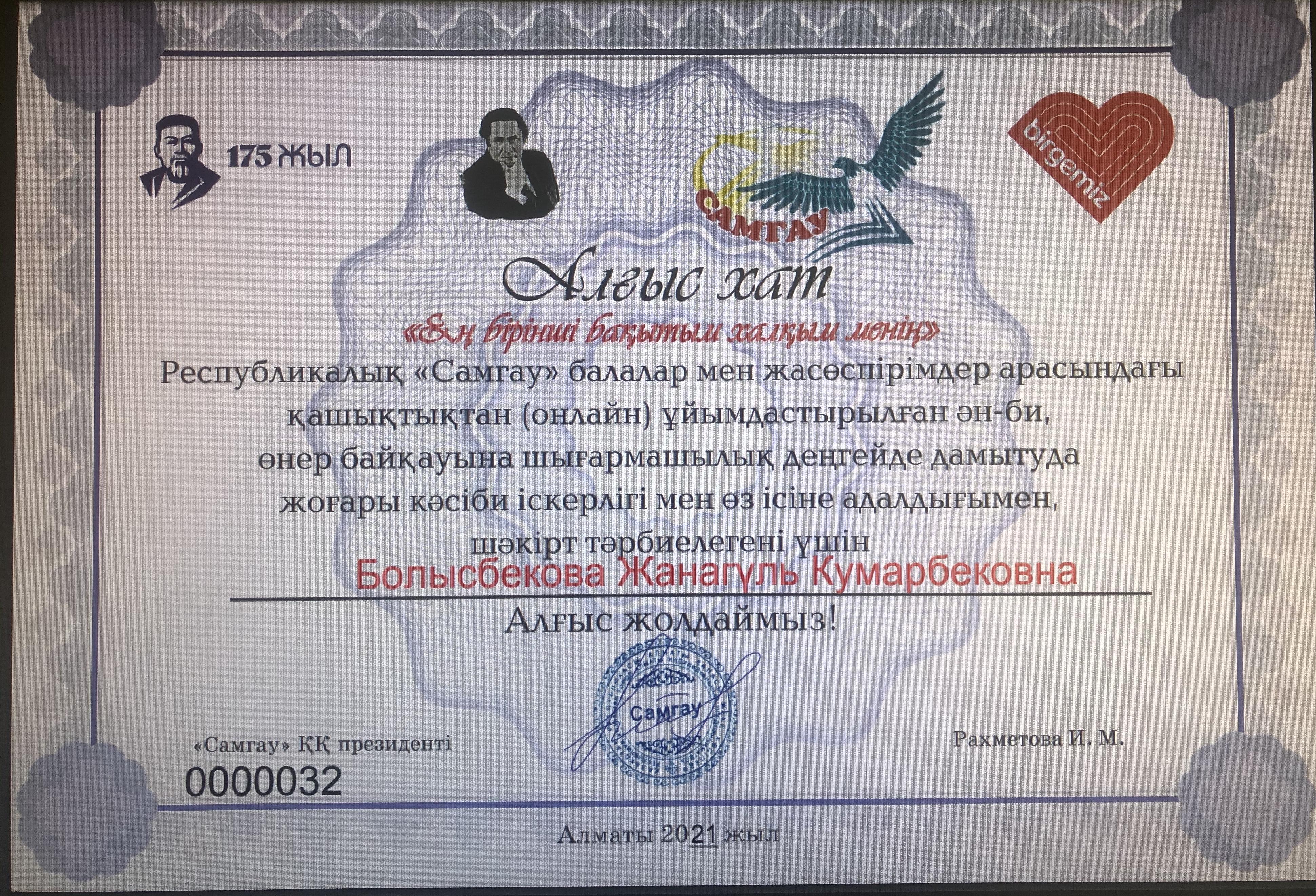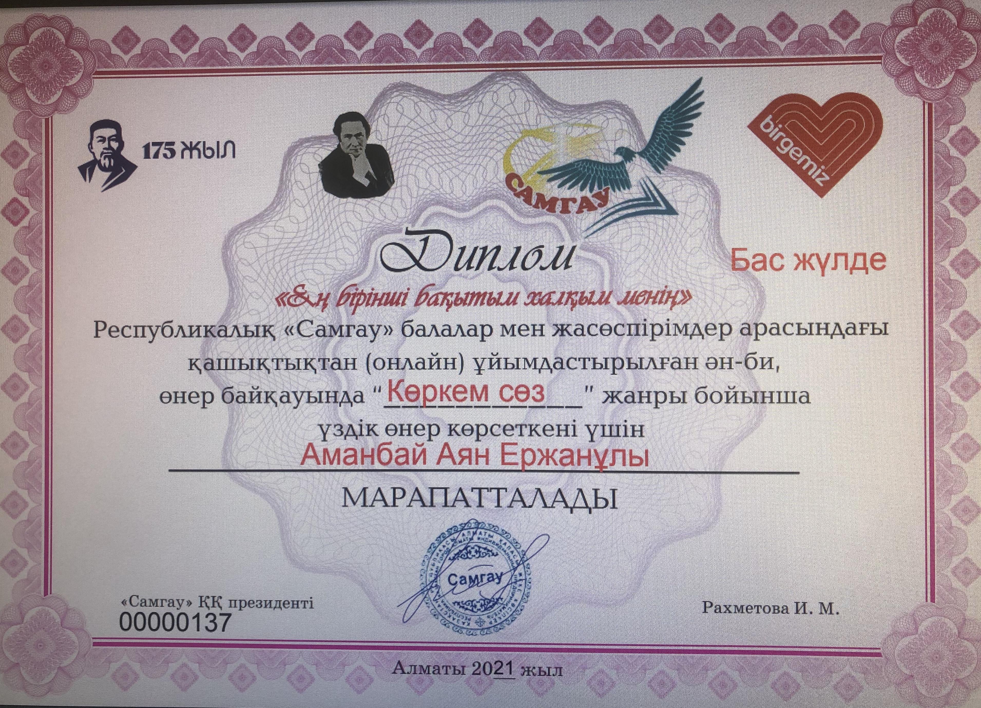 Республикалық "Самғау" балалар мен жасөспірімдер өнер байқауына "Көркем сөз" жанры бойынша 4 "Б" сынып оқушысы Аманбай Аян қатысып, бас жүлдеге ие болды. Оқушымыз диплом және кубокқа ие болды,Жетекшісі Алғысхат