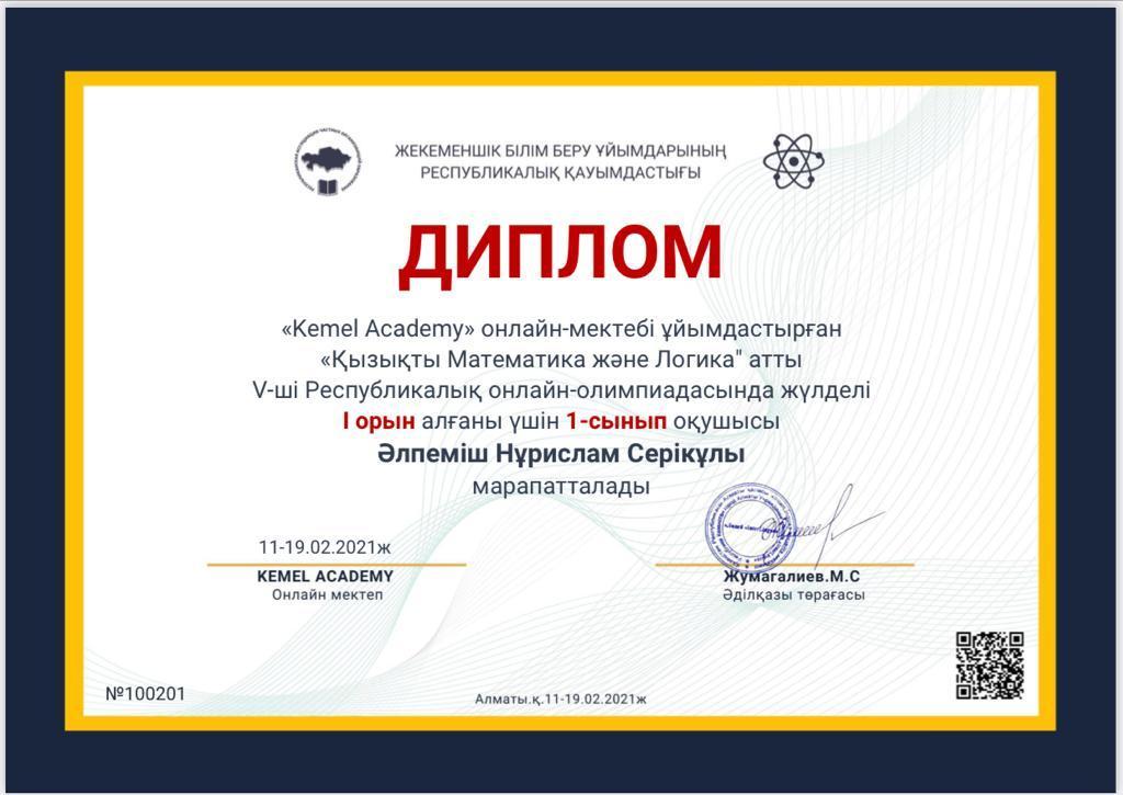 Кемел Академиясы ұйымдастырған "Қызықты Математика және Логика атты Ү-ші Республикалық онлайн олимпиадасына 1 "Б" сынып оқушысы Әлпеміш Нұрислам қатысып, жүлделі І орынға ие болды.