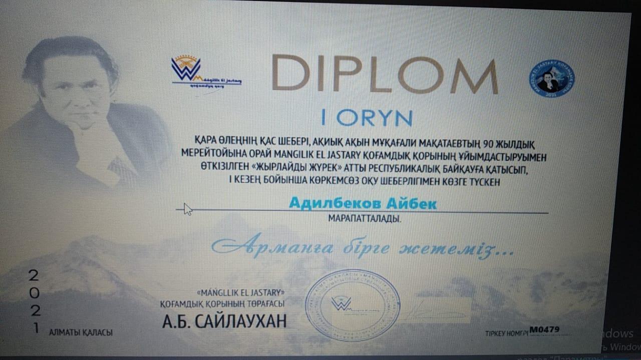 Мұқағали Мақатаевтың 90 жылдық мерейтойына орай "Мәңгілік Ел" қоғамдық қоры ұйымдастырған "Жырлайды жүрек" атты Республикалық байқауда көркем сөз оқу шеберлігімен көзге түсіп, жүлделі І орын алған 6 "Б" сынып оқушысы Адильбеков Айбек