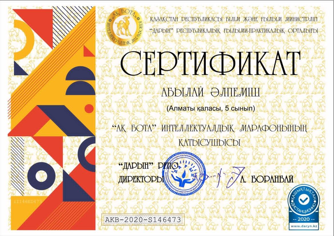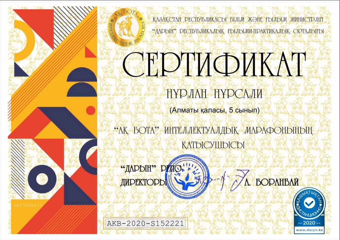 "АҚБОТА" интеллектуалдық марафонына 5 "Г" сынып оқушысы Әлпеміш Абылай ІІ орын, 5 "Ә" сынып оқушысы Нұрсали Нұрлан ІІІ орынға ие болды. Жетекшісі, математика пәні мұғалімі Хурметхан Айбота.