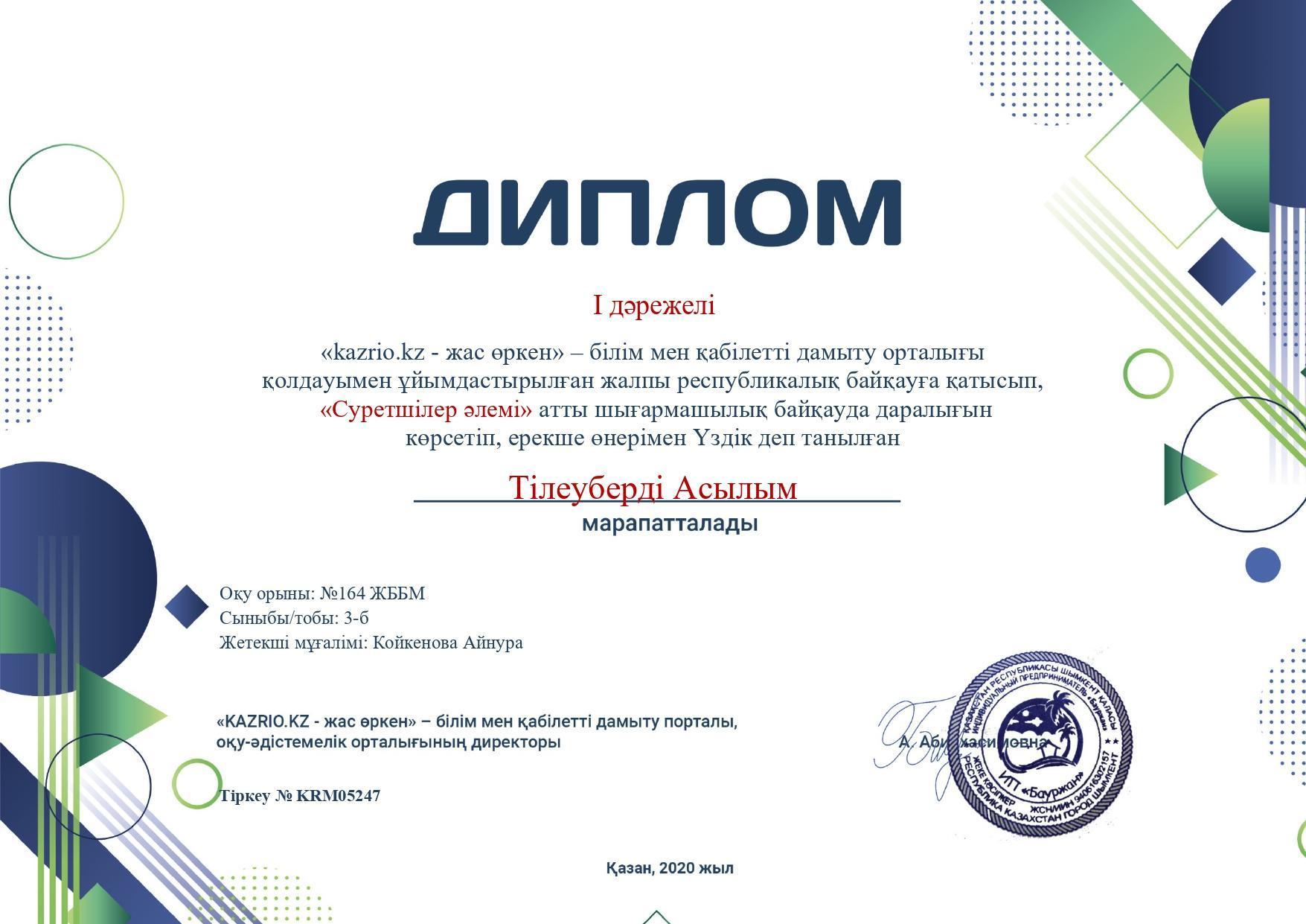 Мектебіміздің 3 б сынып оқушысы Тілеуберді Асылым "Жас өркен"-білім мен қабілетті дамыту орталығы қолдауымен республикалық байқауға қатысып, "Суретшілер әлемі" атты байқауда үздік деп танылып, І дәрежелі дипломмен марапатталды