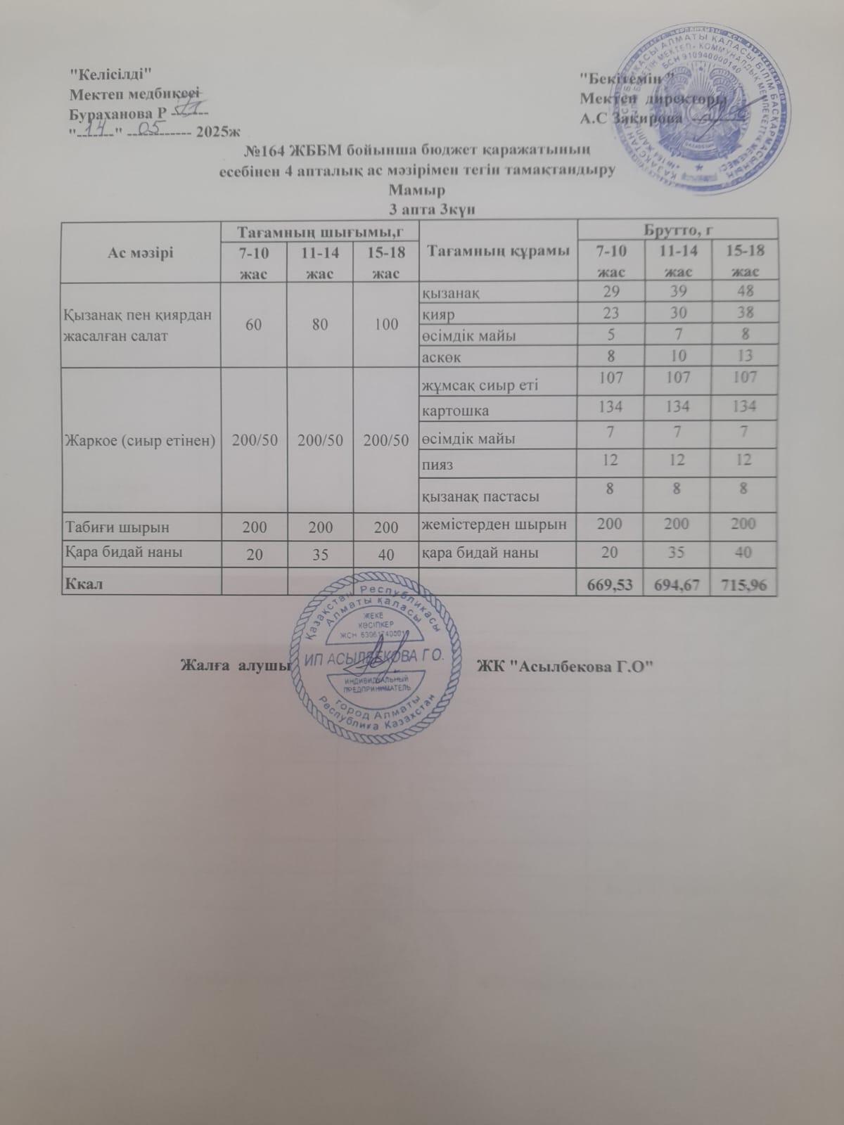Ас мәзірі. 1 апта 1 күн